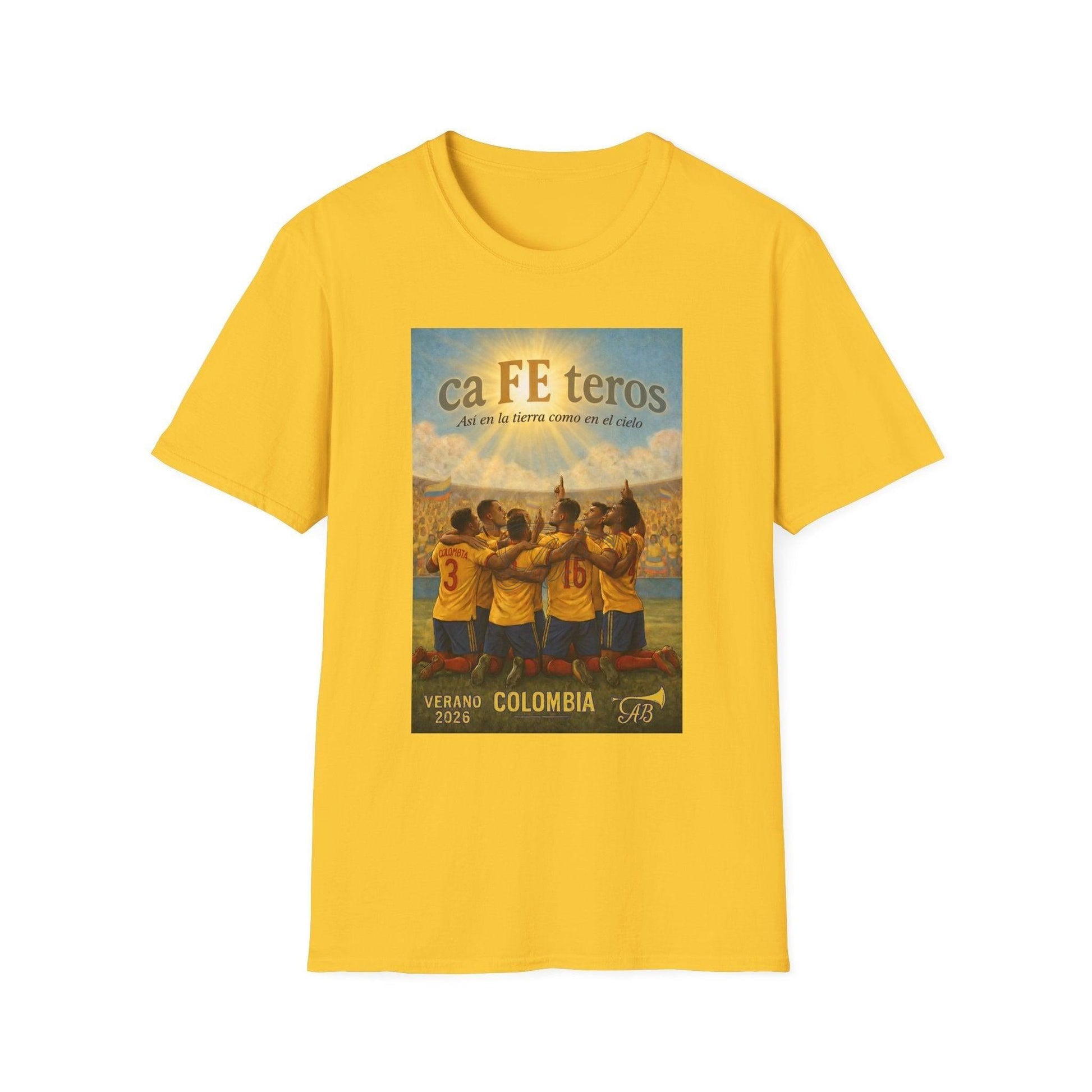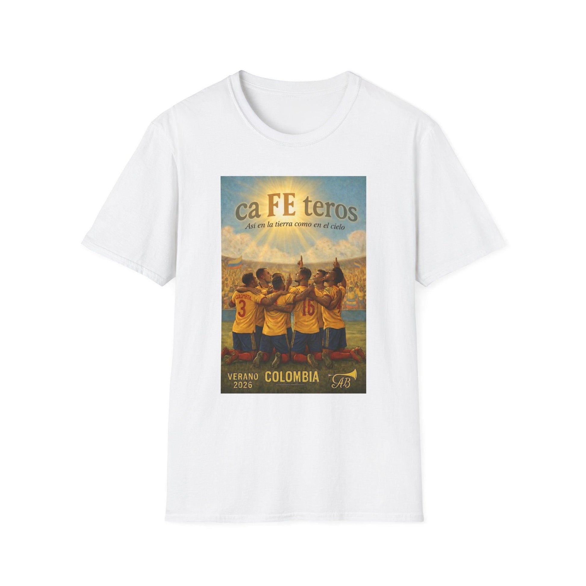 Arraigada en la pasión, la cultura y la creencia, la Colombia caFEteros T-Shirt captura el alma del fútbol colombiano a través de una ilustración de estilo clásico y atemporal. El diseño presenta a un equipo unido bajo cielos radiantes, un homenaje visual a la FE, la perseverancia y los momentos compartidos que van definir el fútbol este verano.